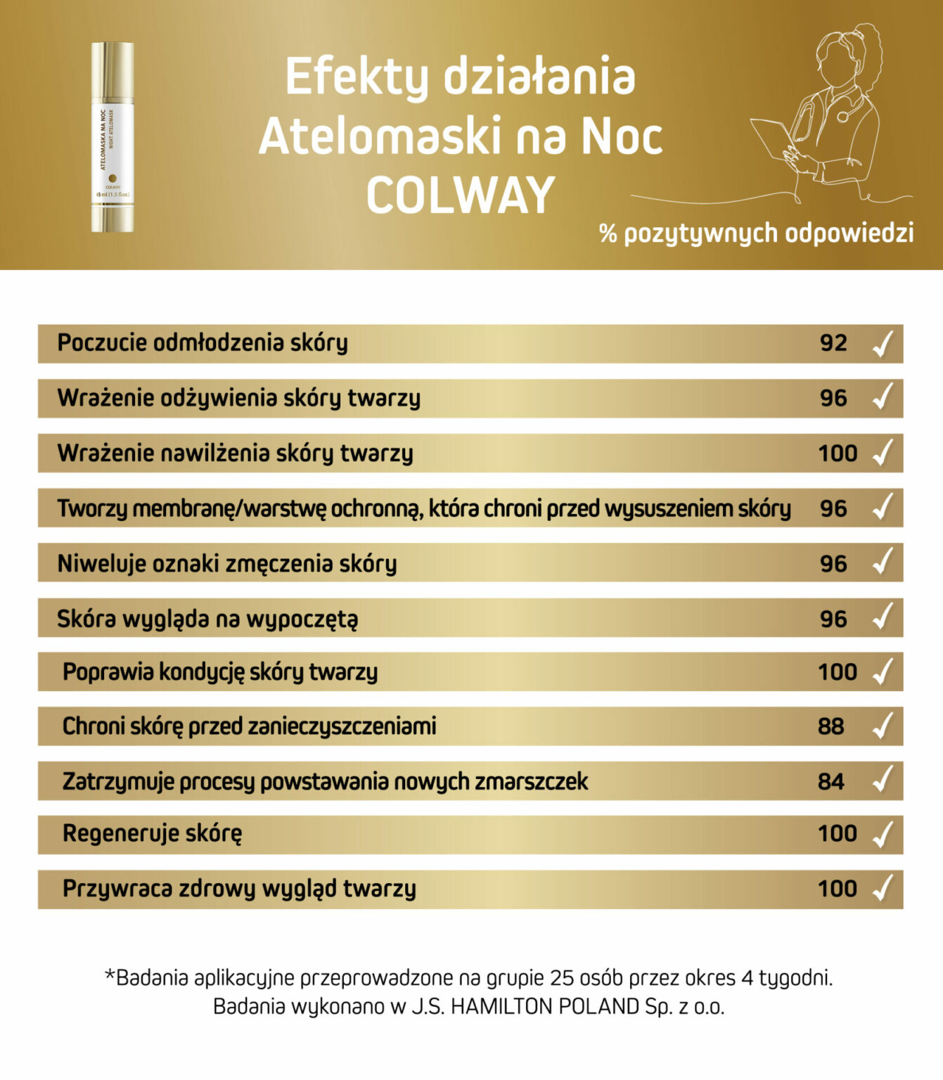 Doskonała jakość produktu obroni się nawet na wymagających testach przeprowadzonych w certyfikowanym laboratorium i w badaniach aplikacyjnych z udziałem użytkowników w różnym wieku i o różnym typie skóry. Tak też stało się z Atelomaską na Noc COLWAY. Zerknijcie do zestawienia poniżej – potwierdza ono, że naprawdę warto przesypiać noce z tym kosmetykiem na skórze, aby cieszyć się znakomitym wyglądem o poranku.