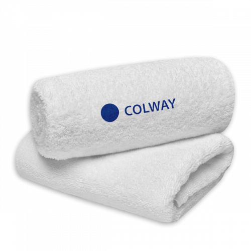 Puszysty, biały ręcznik z haftem z logo COLWAY. Z egipskiej 100% bawełny, o gramaturze 500 g/m2,